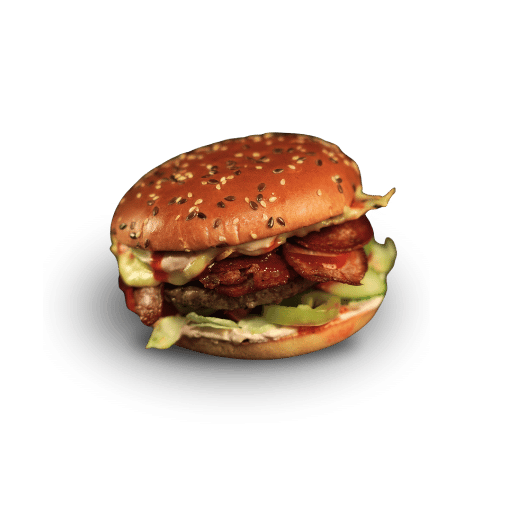 BBQ szósz, bacon, paradicsom, csemegeuborka, lilahagyma, marhahúspogácsa, pirított sajt