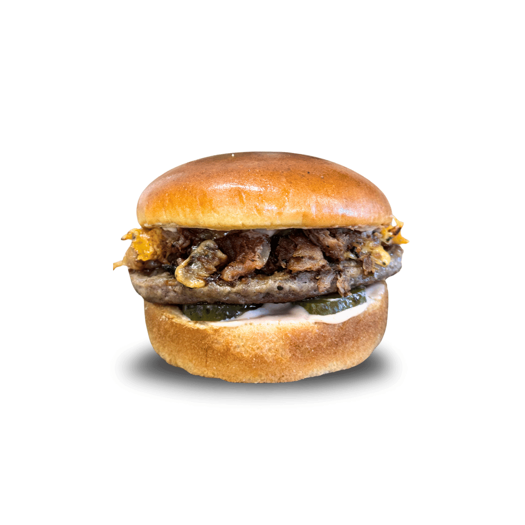 Kézműves buci, házi szósz, csemege uborka, tépett malac hús, marhahús pogácsa, cheddar sajt
