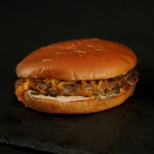 Hamburger buci, Marhahús, Savanyú ubi, Cheddar, Grillezett hagyma, Választható szósz