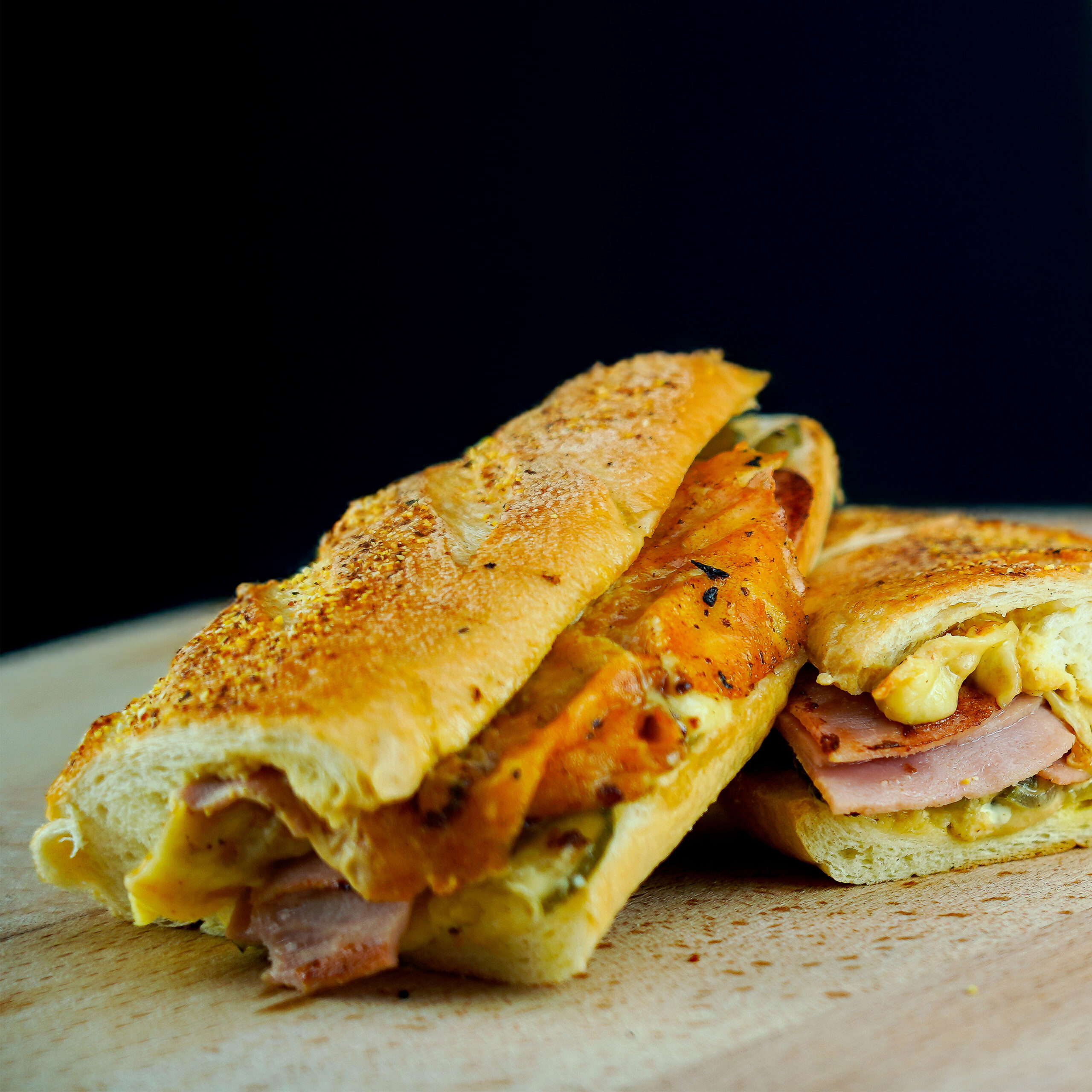 szendvics kifli, szósz, saláta, paradicsom, csemegeuborka, sonka, gomba, pirított sajt